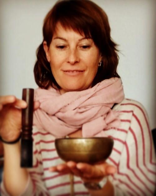 Mari tocando el cuenco tibetano.