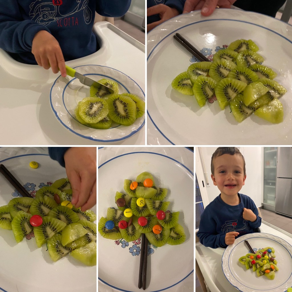Una de ellas ha sido preparar una “receta navideña” en familia. Hemos hecho un árbol de Navidad con kiwi, y la verdad que debía estar bueno, porque Martín se lo comió rápidamente.