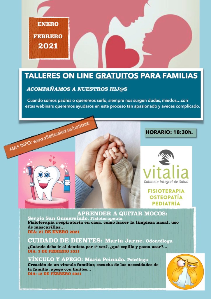 La primera Webinar tendrá lugar el miércoles 27 de enero y lleva por título, “Aprender a quitar mocos”, en la que se tratarán temas como la importancia de los mocos, cómo hacer la fisioterapia respiratoria en casa, aprender a hacer la limpieza nasal correcta o el uso de mascarillas en los niños, y será impartida por el fisioterapeuta Sergio San Gumersindo.