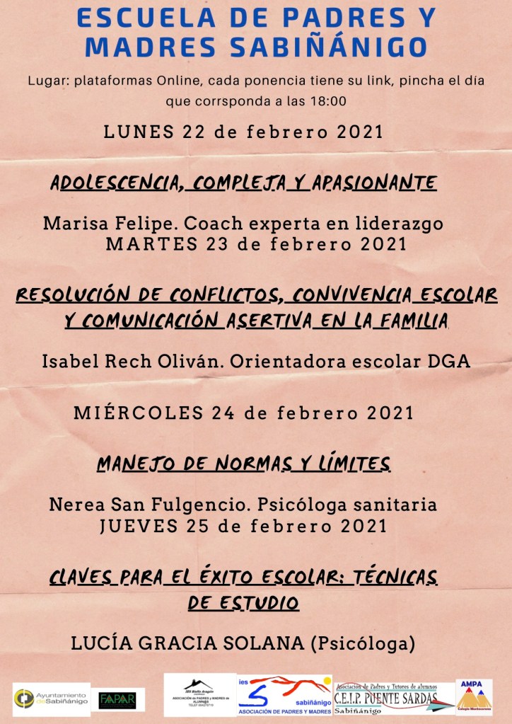 Hoy comienza un ciclo de charlas on-line, Escuela de Padres y Madres Sabiñánigo, organizadas por las AMPAS de Sabiñánigo junto a la asociación FAPAR, y con la colaboración del Ayuntamiento de Sabiñánigo.