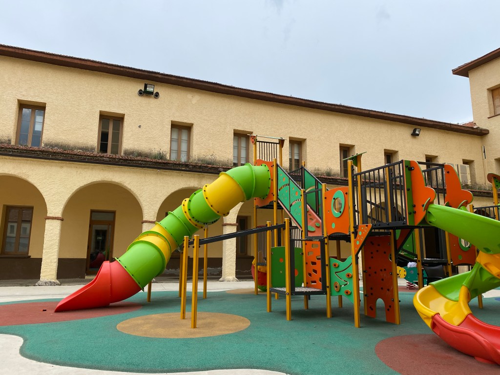 Hace unos años se llevó a cabo la renovación de los juegos infantiles de esta plaza ya que no cumplían con las nuevas normas de seguridad infantil, y se aprovechó para colocar este colorido conjunto de toboganes.