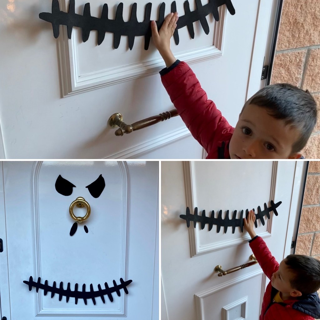 Para ir ambientando la celebración a lo largo de la semana, además de las actividades que han realizado en el colegio (biblioteca de libros de miedo, manualidades y bailes), en casa también hemos decorado nuestra puerta para “asustar” a los que nos visiten.