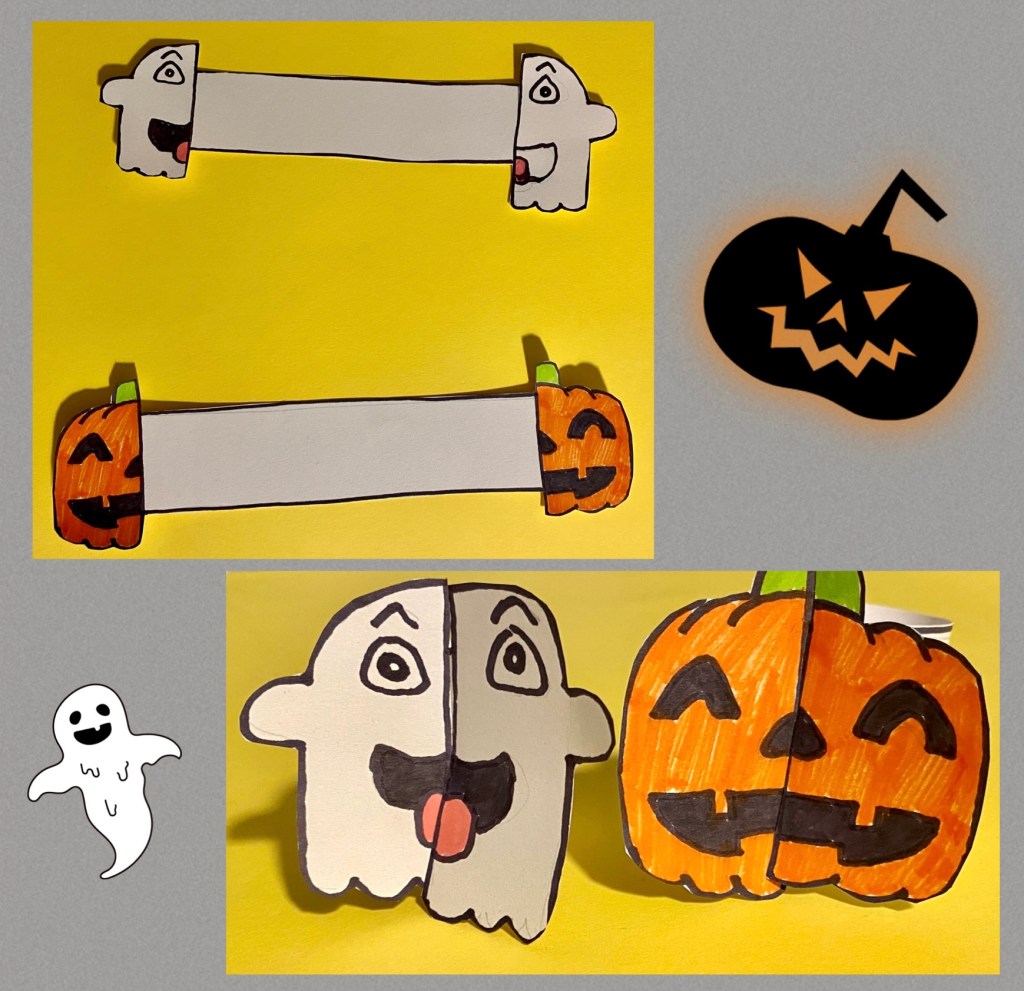 Además de decorar la puerta de nuestra casa, hemos preparado una manualidad de Halloween muy sencilla. Se trata de unos brazaletes con formas de fantasma y de calabaza.