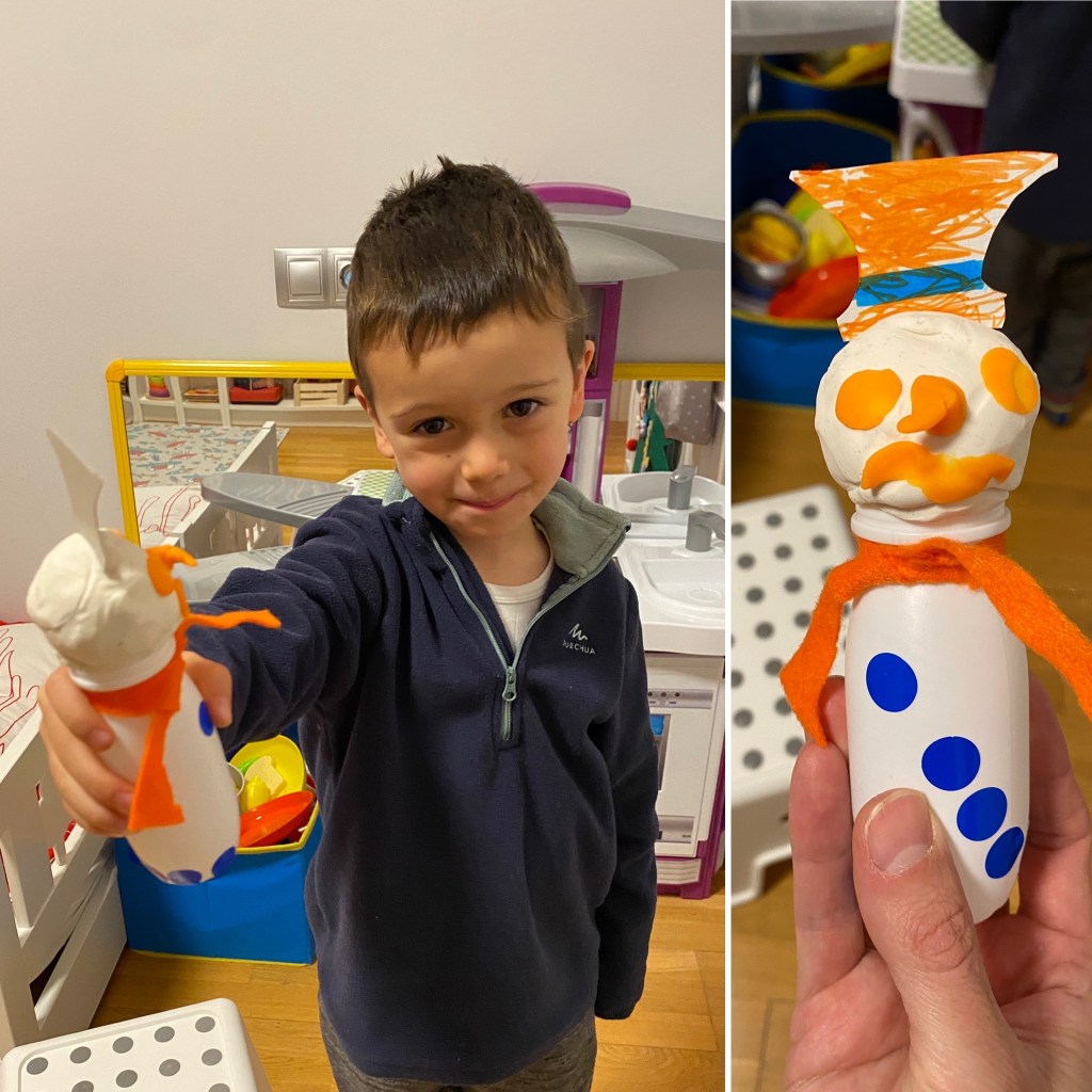 Se comienza haciendo una bola con la plastilina blanca, y se coloca sobre el bote de yogur. Con la plastilina naranja se hacen los ojos, boca y nariz. Se decora el bote con los gomets, para que parezca el cuerpo del muñeco, y con la tira de fieltro se hace una bufanda.