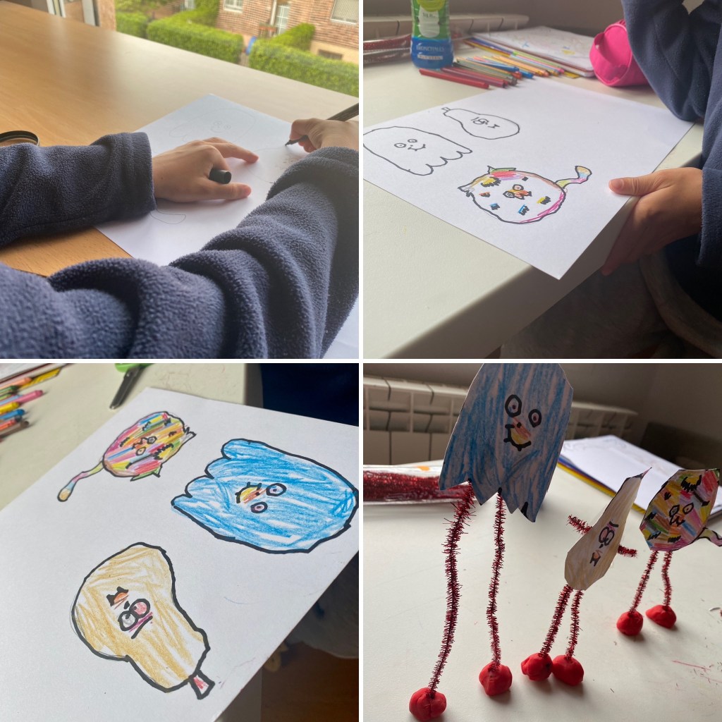 Se comienza dibujando en la cartulina, con el lápiz, los monstruos. Una vez dibujados, se repasan con rotulador negro, se colorean y recortan.