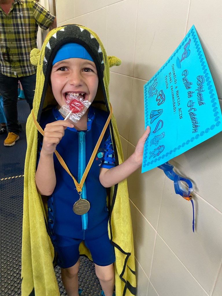 Ah, y por acabar el curso, le han regalado una medalla de “oro”, una piruleta y un diploma, que informa que pasamos al nivel “trucha”.