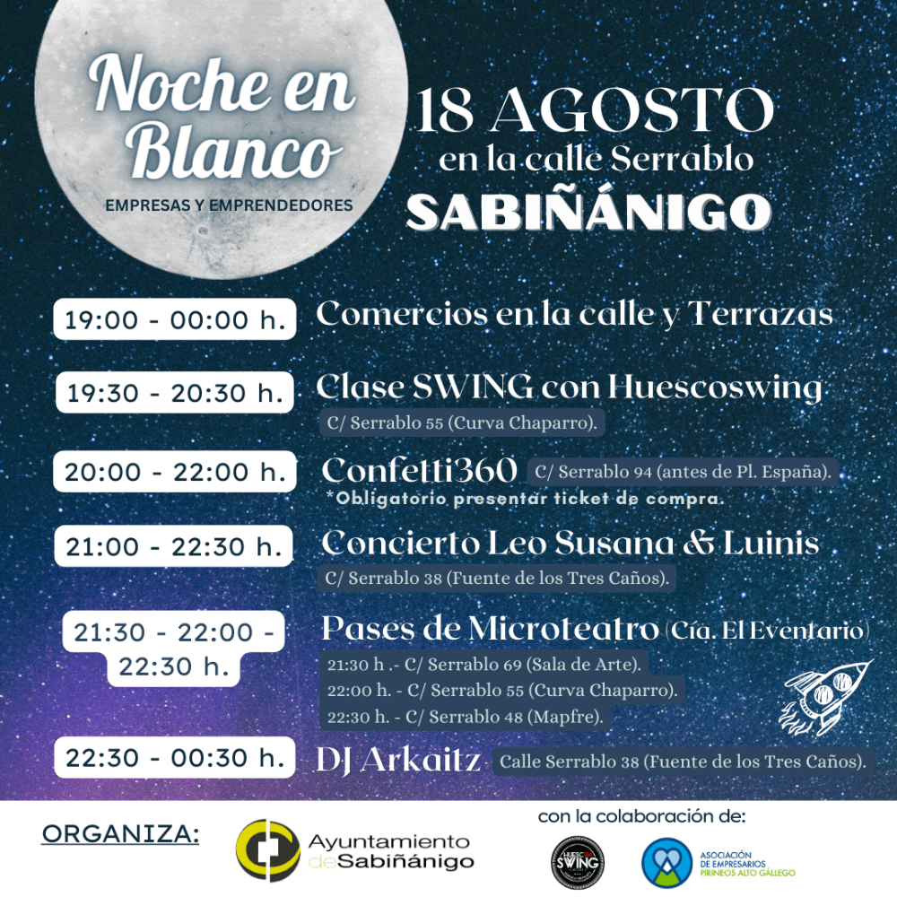 La Noche en Blanco es un escaparate para empresas y emprendedores de Sabiñánigo, que tendrá lugar en la calle Serrablo hoy, viernes día 18 de agosto, desde las 19:00 hasta las 00:00 horas, donde terrazas y comercios de Sabiñánigo sacarán sus productos a la calle.