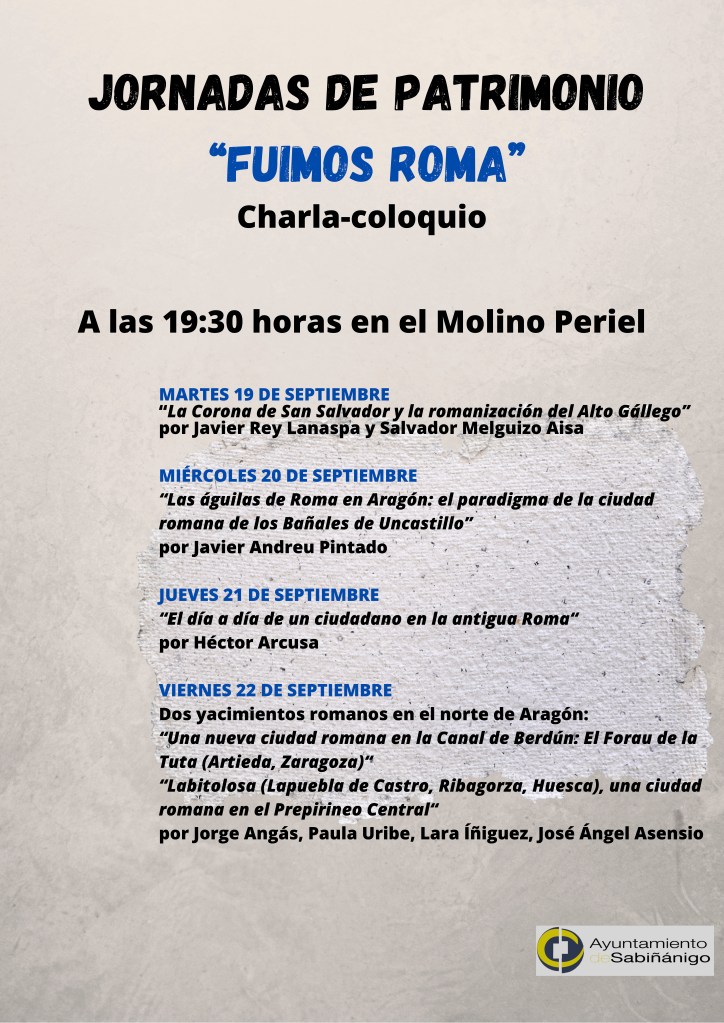 Continuará el miércoles, día 20 de septiembre con la charla-coloquio, «Las águilas de Roma en Aragón: el paradigma de la ciudad romana de Los Bañales de Uncastillo», a cargo de Javier Andreu Pintado, catedrático de Historia Antigua de la Universidad de Navarra y director científico del proyecto histórico-arqueológico de Los Bañales.