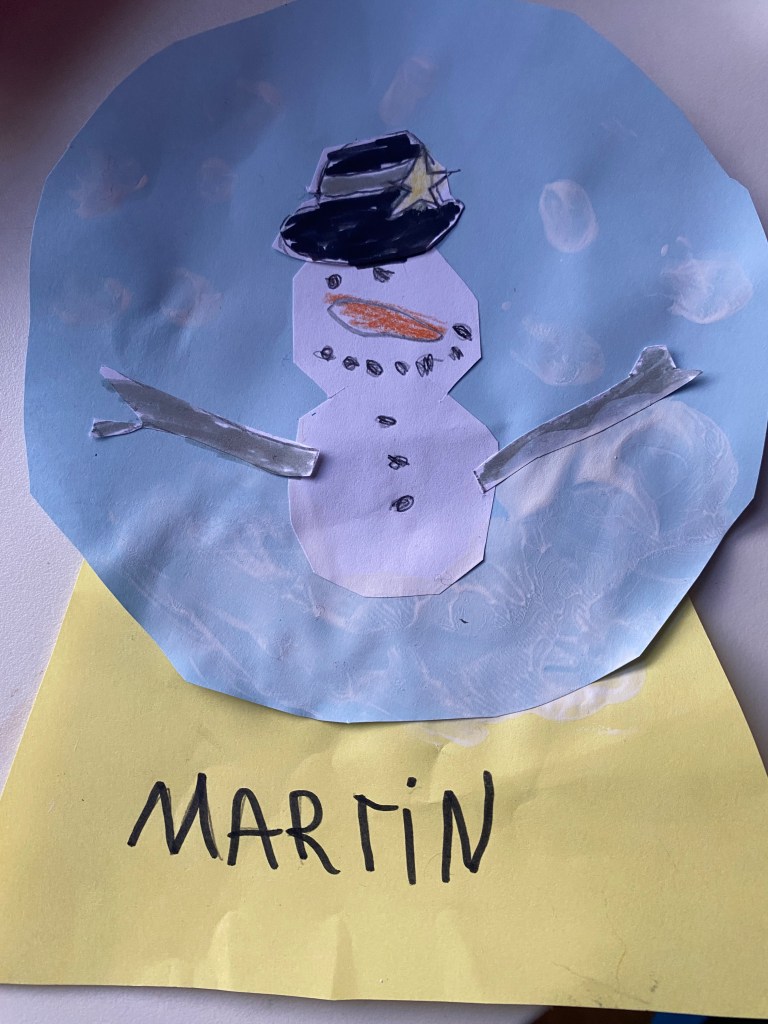 Por último, con la pintura de dedos blanca, pintamos la nieve que decora la bola y escribimos el nombre del autor de la manualidad, en este caso Martín.