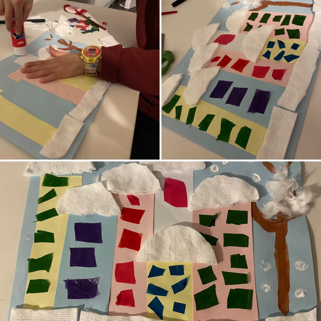 Para las ventanas, pegamos trozos de papel celofán de colores.