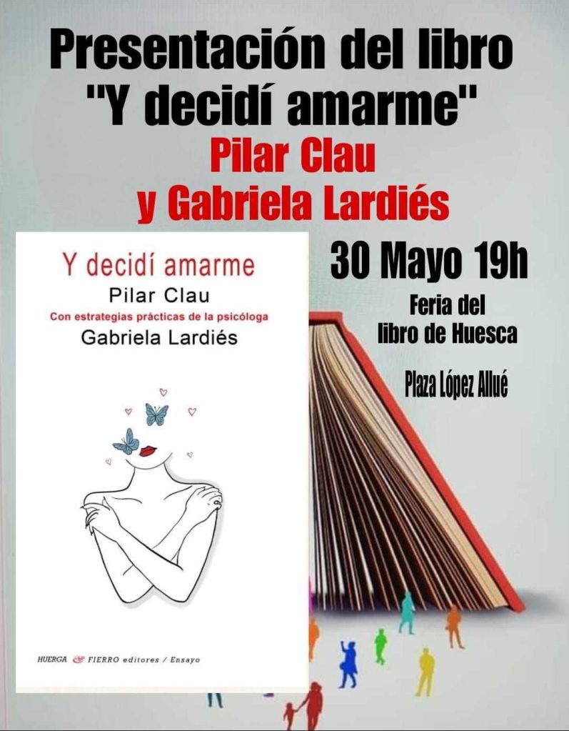 Mañana día 30 de mayo, se presentará el libro “Y decidí amarme”, de Pilar Clau, con estrategias prácticas de la psicóloga Gabriela Lardiés, en la feria del libro de Huesca. La presentación será a las 19,00 horas.